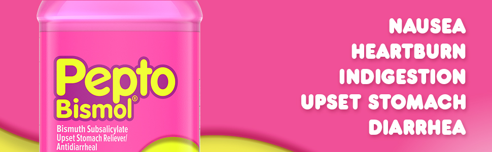 The original upset stomach and diarrhea reliever. Relieve heartburn, indigestion, nausea, upset stomach, and diarrhea with the smooth original liquid formula that comes with just a hint of a fresh wintergreen taste. Use as directed. Bismuth Subsalicylate. Upset Stomach Reliever Antidiarreheal. Whether you’re looking for relief in liquid, chewables, or caplets Pepto-Bismol has you covered. With five-symptom digestive relief, it’s no wonder that we’re the No. 1 pharmacist-recommended brand for relief of upset stomach due to overindulgence in food and drink. Get five-symptom digestive relief from: Heartburn Indigestion Nausea Upset Stomach Diarrhea And, when little tummies get upset, turn to Children's Pepto Antacid Chewable Tablets for help. When belly woes hit, Pepto-Bismol has you covered. Based on Pharmacy Times OTC survey 2013 (Upset Stomach Remedies Category).