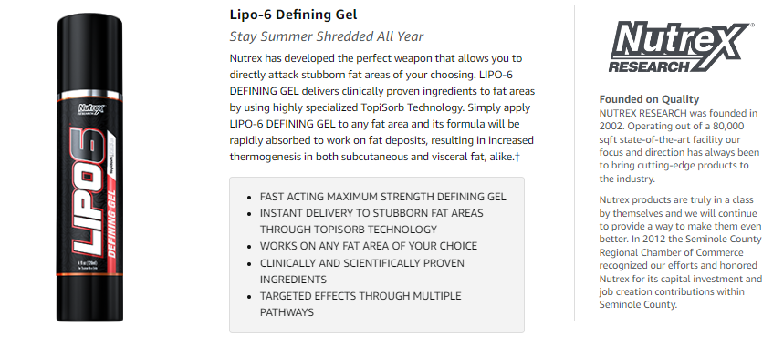 ![]() ![]() ![]() (Nutrex Research®) LIPO-6 Defining Gel 120 ml เจลสลายไขมัน เร่งการเผาผลาญ ขับเหงื่อ เหมาะสำหรับผู้ออกกำลังกาย - ออกฤทธิ์เร็วด้วยเทคโนโลยี TopiSorbTM ปรับปรุงการออกกำลังกายโดยเกิดความร้อนทำให้คุณมีเหงื่อได้ดีขึ้น - เหงื่อมากขึ้น เผาผลาญมากขึ้น ความร้อนที่ตรงจุดกับไขมันที่สะสมอยู่ ส่งผลให้การสร้างความร้อนเพิ่มขึ้นทั้งในไขมันใต้ผิวหนังและไขมันภายใน - ทาครีมกระชับสัดส่วนบริเวณขา ท้อง หน้าท้อง และแขน เพื่อช่วยกระชับ ปรับสี ขับน้ำ และลดพุง เหมาะสำหรับผู้ชายและผู้หญิงที่ต้องการลดเอว หน้าท้อง และเซลลูไลท์ - ใช้งานง่าย: เจลไม่เหนียวเหนอะหนะ และไม่เปื้อนเสื้อผ้า - บริเวณที่ดีที่สุดที่จะใช้คือบริเวณไขมันหน้าท้อง หลังส่วนล่าง และเลิฟแฮนด์ ก้น และเอ็นร้อยหวาย